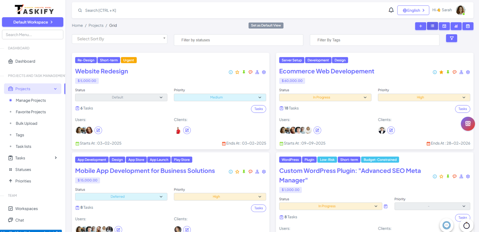 The Grid View shows projects as cards, making it easier to visualize multiple projects at once. Each card can display: