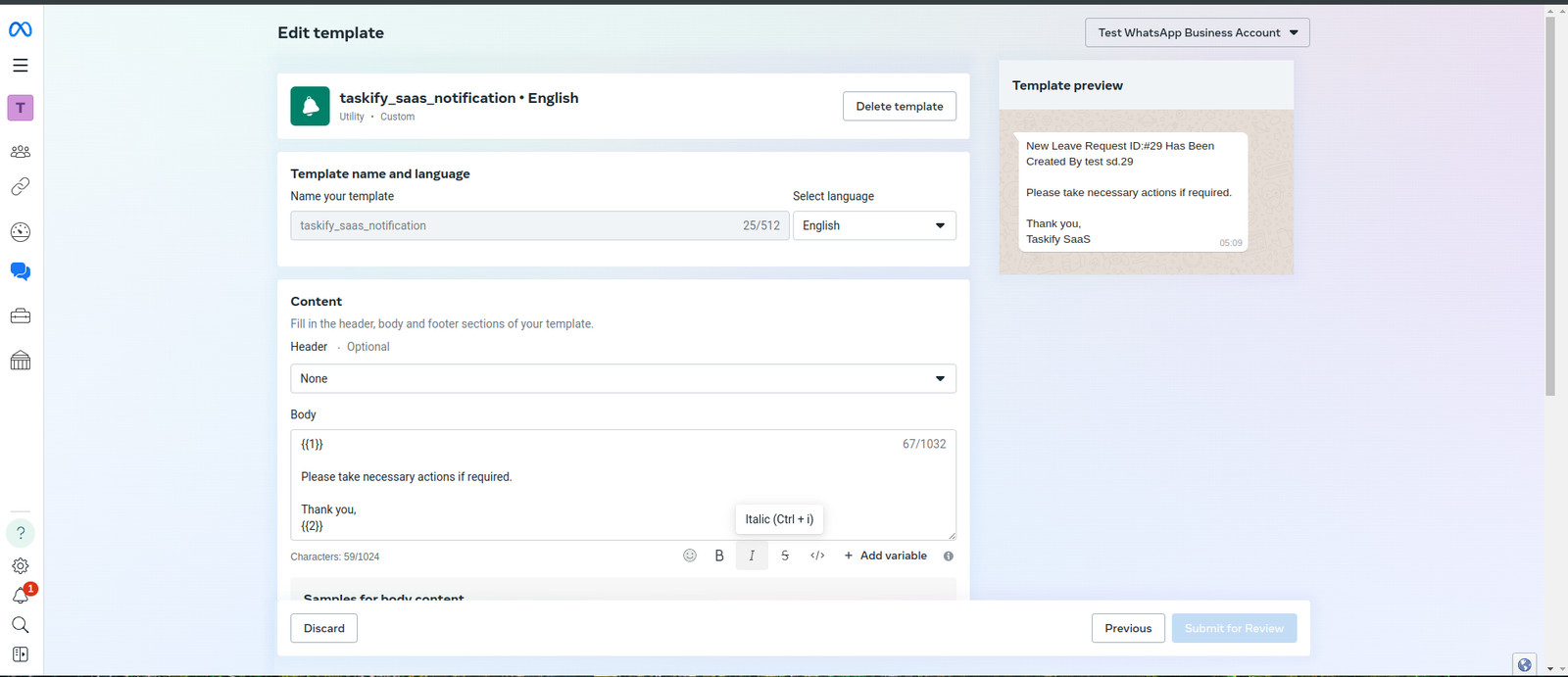 In Taskify, when sending a WhatsApp notification, select the approved template.