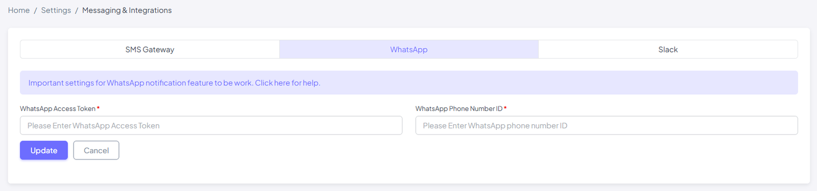Settings → Messaging & Integrations → WhatsApp.Enter the following: